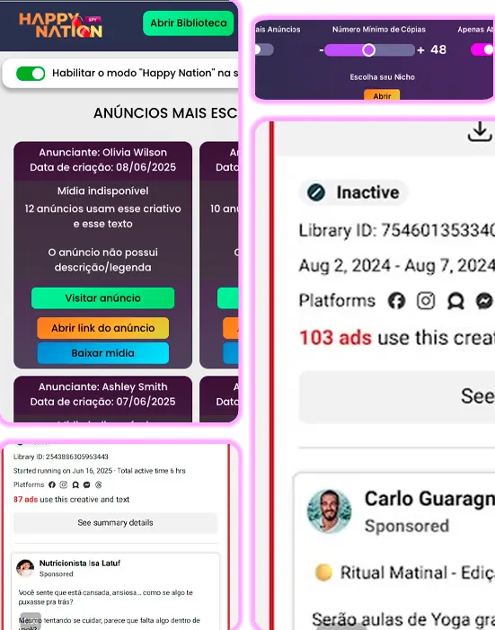 Com apenas 1 clique, o Happy Nation Spy revela os criativos mais escalados desse mercado, seja no Brasil, EUA ou LATAM, destacando automaticamente os que têm maior número de variações.