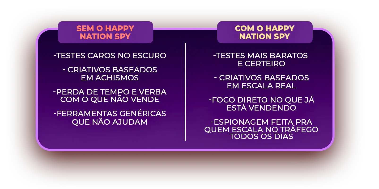 O Happy Nation Spy foi feito pra ser simples: com 2 cliques, você já encontra criativos que estão sendo escalados por grandes players.